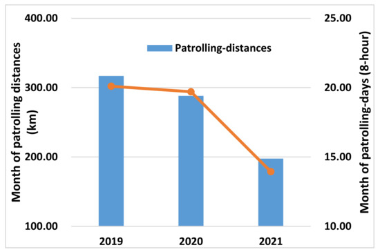 There was a decline in the average distances in 2019 (19.94 ± 8.09) and 2021 (11.08 ± 5.37) and working day (8 h/day) in 2019 (1.23 ± 0.93) and 2021 (0.84 ± 0.55). Additionally, there was a considerable decline in patrolling distances/months 2019, 2020, and 2021 (316.85 km, 288.11 km, and 197.56 km respectively). In patrolling hours/month, there was a similar increase in 2019 and 2020 with around 20 patrolling days. The lowest was about 14 patrolling days in 2021 (Figure 4).