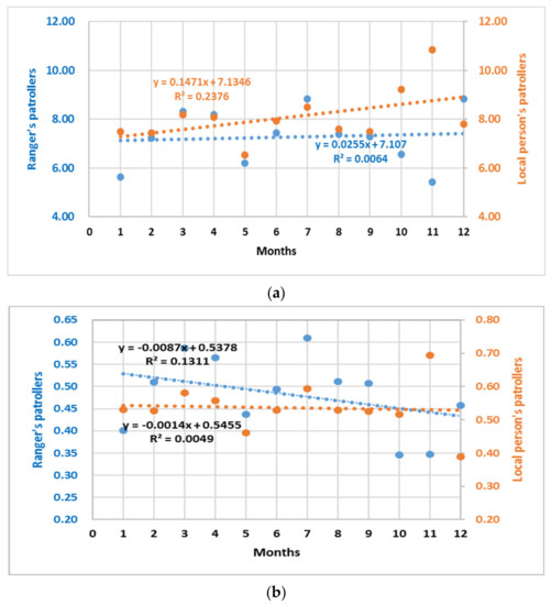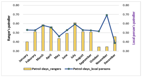 Additionally, there was considerable decline in working days and distances by rangers that were the lowest at 2.7 patrolling days and 6.0 km/per month distances in October and November (Figure 5 and Figure 6). Actually, it is the rainy season in this month; therefore, it is very difficult to patrol because of slippery walking [10,29]. In these instances, the number of patrolling rangers is limited because they are not used to patrolling in the field compared to the local persons [19]. Thus, the head of the Nam Tien Fs organizes the local persons in villages to carry out patrolling in the field with a steady number of patrollers [11]. In addition to this, it seems to be that the accounts of illegal encounters like logging, transportation, and hunting exponentially decline in lessons learned [23,27], thus the number of rangers beforehand, was excessive.