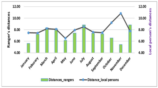 Thanks to local patrollers, the average local persons, distances, and working days were 1.45 ± 0.50, 8.00 ± 4.46, and 0.53 ± 0.37. The number of local persons was moderately correlated with walking distances and working days (rs = 0.73, p < 0.01; rs = 0.71, p < 0.01). The numbers of local persons and walking distances were significantly different during monthly patrolling (H = 89.17, p < 0.01; H = 33.79, p < 0.01). Furthermore, the number of local persons was fluctuant and there was a peak of kilometers walked and patrol days in November (around 11 km distances/per month and 0.7 h-day/per month) (Figure 5 and Figure 6).