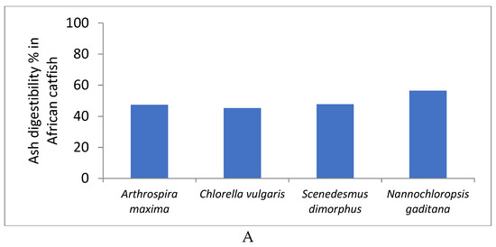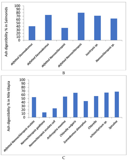 Digestibility of ash of microalgae in different fish (A) African catfish (B) Salmonids (C) Nile tilapia.