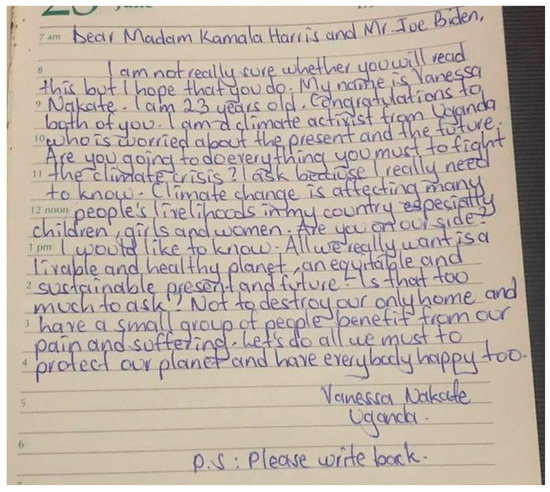 The second incident happened after Vanessa wrote a letter to the President-Elect (Joe Biden) and Vice President-Elect (Kamala Harris) of the United States of America (USA) on November 2020 (Figure 1). The letter was handwritten and uploaded to social media platforms. In the letter, she congratulates the recipients on being elected to office and asks them if they will, “…do everything you must to fight the climate crisis?” She explains how climate change disproportionately affects women and girls in her country and asks, “… are you on our side?” At the end of the letter, she states that she hopes that they will write back. Once again, Vanessa received intense backlash and trolling, explained in more detail in the Section 3.