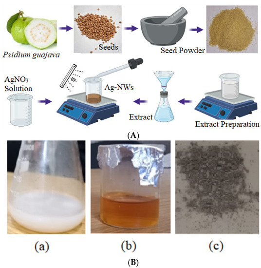 In order to prepare Ag-NWs, Psidium guajava seeds extract (5 mL) was added into the aqueous solution of AgNO3 (1 Mm/10 mL) under standard conditions. The mixture was constantly stirred at 50 °C with continuous irradiation of UV-light of 265 nm for four hours. The color change from milky white to yellow and finally orange indicated the formation of the silver nanowires [41]. Ag-nanowires were collected after filtration followed by oven drying at 50 °C for 30 min (Figure 1A,B).