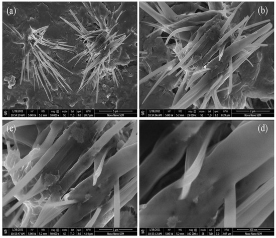 The morphology and surface properties of the product were determined by field emission scanning electron microscopy (FE-SEM) (Figure 4a–d). It is evident that the product has a wire-like morphology mainly formed and stabilized due to the action of unsaturated linear ketones. The well-separated wires have ~12.8 μm length and ~200–500 nm diameter. This unique morphology results in an excellent surface area expansion, resulting in brilliant catalytic removal of the organic dyes. The performance of a catalyst is chiefly dependent on the surface area, stability, surface charge and shape of the molecules of a catalyst. Amongst them, surface area and shape have been shown to have a more powerful role in the adsorption and reduction of the adsorbed entities in photocatalysis phenomena as mentioned in previous works [56].
