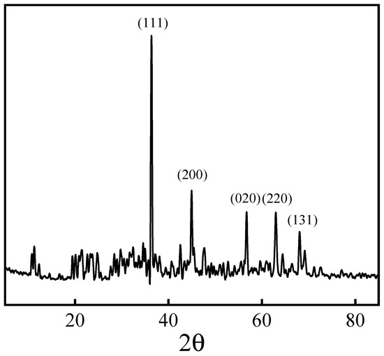 Silver nanowires were also characterized using the X-ray diffraction method to elucidate the structure (Figure 5). The fingerprint pattern has four typical diffraction features corresponding to (111), (200), (020), (220) and (131) planes, and all the four peaks might be indexed to the phase-centered cubic structure of silver (JCPDS-04-0783) [57,58]. The final product owes 100% purity as there was no peak detected for reflection, which mainly corresponds to nitrate ions of precursor solution and other impurities. The peak intensity profile was individual of the face-centered cuboidal structure of Ag-nanowires. The crystallite size is not entirely clear in FESEM due to the large nanowire diameter [59]. However, the particle size is calculated by the Debye–Sherrer Equation.