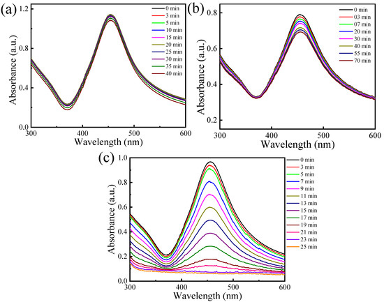 Methyl Orange (MO) is extensively used as a textile dye (azo-dye) for the dying of textile fabrics [61]. The reduction of MO was achieved by using freshly prepared Ag-NWs with excessive NaBH4. The rate of reduction of methyl orange without catalyst in the presence of NaBH4 is very slow (Figure 6a). This poor performance is due to the presence of a high energy barrier of mutually repulsive interactions between the borohydride anion and methyl orange ion, which should be overcome only by a catalyst [62]. Moreover, in the presence of a catalyst only no reduction occurs due to the same interactions as mentioned above (Figure 6b). However, in the presence of a catalyst and NaBH4, reduction of azo-dye takes place (Model reaction). Initially, NaBH4 and catalyst will adsorb on the surface of the dye and then a reduction reaction will proceed at a faster rate. The characteristic peak of MO solution was recorded ~458 nm and catalytic reduction was observed by a sharp decline in intensity merely in 25 min (Figure 6c).
