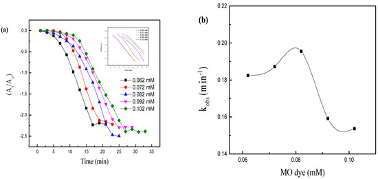 MO dye’s concentrations were taken, ranging from 0.072 to 0.102 mM with 0.010 mM difference. Figure 8a shows the induction, reaction and completion times of the catalytic reaction between MO-dye and NaBH4 on the surface of Ag-NWs. As the concentration of the MO-dye increases, while keeping the concentrations of Ag-NWs and NaBH4 constant, the time of degradation increases [65]. The reason behind this factor is the constant concentration of Ag-NWs, which illustrates the limitation of surface-active sites for incoming reactants [66]. The figure inset (6) shows the negative slopes for finding the apparent rate constant for Pseudo first-order reaction following the Langmuir–Hinshelwood mechanism (LHM) [67,68].