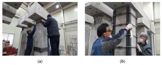 The transverse confinement techniques that are widely applied to the reinforcement and retrofitting of RC columns with insufficient seismic capacity include external steel jacketing [,,,,,,], fiber-reinforced plastic (FRP) composite wrapping [,,,,,], external post-tensioning or prestressing [,,,,,], and bonded steel plating [,,,,,]. These reinforcement methods should improve the RC columns’ seismic capacity and provide precision, simplicity, and economic feasibility in construction, as well as convenience in maintenance. The FRP composite wrapping is extensively applied as it provides advantages such as light weight, high strength, high corrosion resistance, and non-expansion of the cross-sectional area. The wet construction methods, such as external steel jacketing, FRP composite material reinforcement, and bonded steel plating have disadvantages due to long retrofitting and wet operations []. The dry construction methods, such as external post-tensioning, have excellent precision and economic feasibility in the construction but have disadvantages such as the corrosion of the externally exposed steel materials and the need for the periodic addition of lost prestress. Recently, hybrid reinforcement methods have been presented by combining the advantages of different reinforcement materials and reinforcement methods [,,,,,,,].