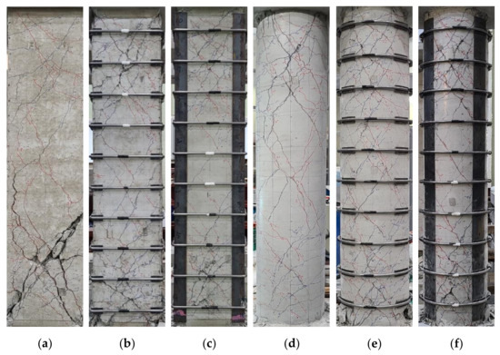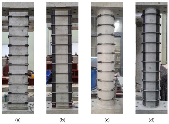 A minor earthquake event may significantly damage reinforced concrete (RC) structures due to structural degradation, such as the extension of the concrete cracks caused by the land subsidence and imbalanced service load, the concrete carbonation, and the corrosion of reinforcing steel bars. In addition, the lack of shear reinforcement reduces the load-carrying capacity of the RC column members against an earthquake event, leading to a brittle failure of the columns. In the design of RC columns, the hoop reinforcement is used to prevent the buckling of longitudinal rebars, increase the shear capacity, and enhance the transverse confinement of the core concrete. A diagonal tensile failure has been observed in the RC columns constructed according to the old design provisions, which failed to provide the minimum transverse reinforcement ratio and appropriate anchorage details about hoops [,]. Degraded structures or those lacking shear reinforcement need reinforcement or retrofitting to secure the seismic capacity required by the current seismic design codes. According to the Caltrans seismic provisions [], RC columns must have a displacement ductility of at least 3. It is well-known that the transverse confinement for concrete cover can increase the strength and ductility of the shear-dominated columns lacking shear reinforcement [].