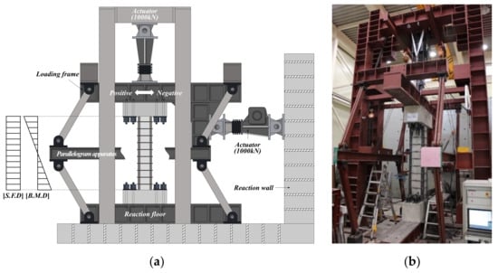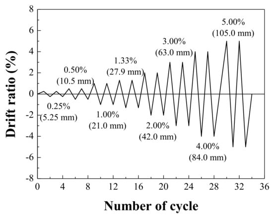 As shown in Figure 4, the loading equipment and instrumentation were set to apply an antisymmetric bending moment and a constant shear force and introduce an axial load corresponding to 10% of the axial compressive strength of the specimens. The parallelogram apparatus in the loading equipment reduced the moment induced in the specimens. The quasi-static cyclic loading test was performed by the displacement control method. Figure 5 shows the loading protocol applied to the experiment. All the specimens were subjected to a load in two cycles in each of the drift ratio stages. The loading was terminated when the applied load was decreased below 85% of the maximum load or when the load resistance was significantly decreased.