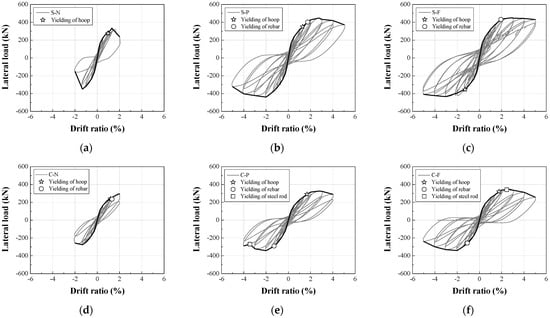 Load–drift ratio hysteretic curves: (a) S-N; (b) S-P; (c) S-F; (d) C-N; (e) C-P; (f) C-F.