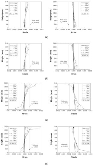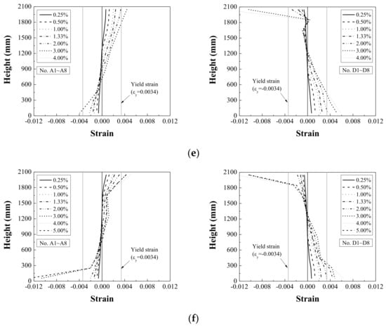 This section describes the strain of the hoops, external steel rods, and longitudinal rebars measured from the strain gauges to examine the effects of the proposed strengthening method on the crack control and the transverse confinement of concrete. Figure 8 shows the strain distribution in the longitudinal rebars at specified drift ratios. The analysis was performed with the strain of the longitudinal rebars marked on the cross-section of the columns (A1 to A8 and D1 to D8). In the control specimens S-N and C-N, the maximum strain of the longitudinal rebars reached 78% (A8 in S-N) and 95% (D8 in C-N) of the yield strain () at a drift ratio of 2.0% (see Figure 8a,b). The control specimens showed the typical linear strain distribution found from the longitudinal rebars of shear-dominated column specimens.