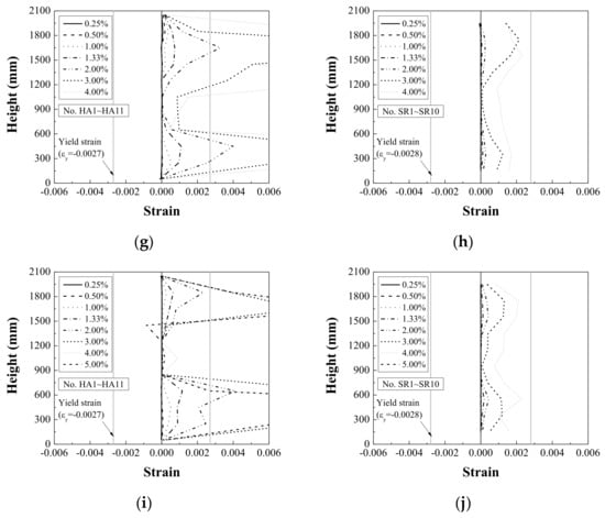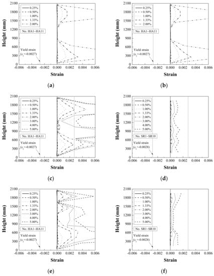 Figure 9a,b show the strain distribution in the hoops of specimens S-N and C-N, respectively. The strain of the hoops, HA3 in S-N and HA10 in C-N, reached the yield strain () at a drift ratio of 0.97% and 1.19%, respectively. After the yielding of the hoops, the strain of the hoops at all positions abruptly increased by the expansion of the width of the shear cracks throughout the specimens.