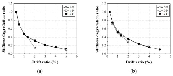 Figure 10 shows the stiffness degradation ratio of the S and C series specimens for the drift ratio. The stiffness degradation ratio was defined as the ratio between the secant stiffness, , and the elastic stiffness, . The stiffness degradation ratio of the S and C series specimens was similar to a drift ratio of 1.33% regardless of the reinforcement’s presence. Since the level of the introduced prestress was low, the difference in the initial stiffness at the drift ratio of 0.25 to 0.50% was negligible between the different specimen series. However, as the drift ratio increased to 3.00%, the stiffness degradation ratio was slightly higher in the C series specimens than in the S series specimens. This may be because the circular external steel rods effectively confined the concrete on the compression side of the plastic hinges compared with the square external steel rods before reaching the maximum load.