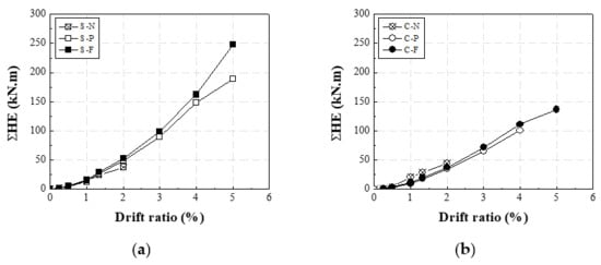 Cumulative hysteretic energy dissipation: (a) S-series specimens; (b) C-series specimens.