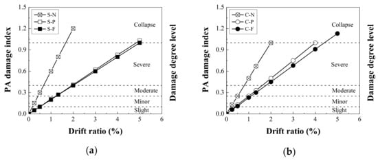 Damage assessment based on the PA damage index: (a) S-series specimens; (b) C-series specimens.