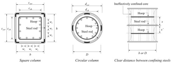 Here, is the confinement effectiveness coefficient. for circular and square sections is expressed as Equations (6) and (7), respectively.