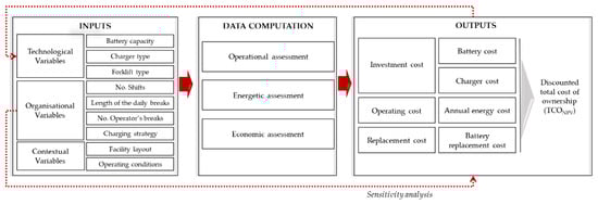 The process leading to the output identification, named as data computation, comprises three steps. The first consists of collecting all the input variables according to the system studied, defining the scenario of analysis. The average duration and the average energy required to perform warehouse operations is estimated according to the input variables (i.e., operational assessment). The second step involves the energetic assessment consisting in an evaluation of the LIB State of Charge (SoC), intended as the percentage of residual energy of the LIB during its operating conditions with respect to the overall energy provided by the fully charged battery. The energetic assessment checks whether the selected battery capacity can supply the energy required for the entire duration of warehouse operations. The final step includes the economic assessment of the examined scenario.