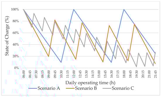 A sensitivity analysis was performed on the organisational variables “No. operator’s breaks” and “Length of the daily breaks” to understand how they may affect the investment and operating costs associated to the LIB forklift operating life. For this purpose, two new scenarios, i.e., Scenario B and Scenario C, were defined. In Scenario B, two operator’s breaks were assumed for each shift, each lasting 45 min. In Scenario C the number of operator’s breaks was considered equal to six breaks per shift, each lasting 15 min, similarly to the break schemes already tested in the operations literature [27]. The new break schemes were designed considering the hypotheses that shorter and more frequent breaks are preferred with respect to longer operating times followed by fewer long breaks [28]. The changes in the selected variables were made by keeping constant the overall length of the operator’s breaks per shift, i.e., 90 min/shift for all scenarios. Table 2 reports the inputs used to perform the sensitivity analysis on the . The results obtained by applying the model to the previously defined scenarios are discussed here in terms of operating assessment, energetic assessment—by studying the battery SoC—and economic assessment, by analysing the . The operating assessment of Scenario B and Scenario C show the same results of Scenario A (base case), being equal all the input variables affecting (i) the cycle time (i.e., forklift type, facility layout), (ii) the hourly power absorbed (i.e., forklift type, facility layout, operating conditions), and (iii) the hourly power provided during the charging (i.e., charger type).