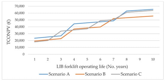 Figure 5 shows the for the analysed scenarios. Here, the main differences are given by the battery investment cost and the battery replacement cost. Scenario B and C have a lower investment cost at year 1 than Scenario A (base case) since the opportunity charging strategy combined with shorter and more frequent operator breaks allows decreasing the size of the LIB, thus lowering the initial battery investment cost. On the contrary, Scenario B and Scenario C have a higher battery replacement cost than Scenario A. This is explained by the decrease in the battery lifespan caused by the more frequent charges performed during the day; the smaller the battery capacity, the higher the number of complete charge and discharge cycles experienced by the battery. As shown in Figure 5, the increase in replacement costs might overcome the savings brought by the reduction of the LIB capacity. At the end of the ten years, the of the Scenario C, which has a lower battery investment cost, is not the lowest, thus revealing that exceeding in the use of opportunity charging so to minimise the battery size might not be economically convenient. This result is explained by the effect of the battery replacement cost. Being charged more frequently, the smallest battery of Scenario C has to be replaced more frequently. The annual energy cost does not vary among the different scenarios, since the variables affecting energy consumption (forklift type, number of shifts, operating conditions), and the variables affecting energy recharge (overall duration of the operator breaks, charger type) remain the same for the three scenarios, as explained in the operational assessment.