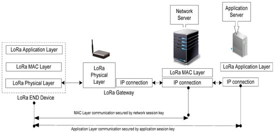 LoRa is Long Range, low power wireless, a low-data-rate communication protocol for building an IoT network developed by Cycleo of Grenoble, France. LoRa uses license-free subgigahertz radio frequency bands [49] It provides long-range transmissions (1–15 km) with low power consumption. It enables the communication between remote sensors and gateways connected to the network Server and Application Servers. The LoRa network is based on a star topology in which end nodes send messages to multiple gateways, which further communicate with the network server [50]. Multiple gateways can receive the message sent by the end node as there is no dedicated linkage between the end node and gateway. Gateways and network servers are connected through proper internet protocol (IP), as shown in the LoRa basic architecture in Figure 1.