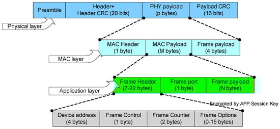 The frame structure of three different layers of LoRa architecture namely the physical layer, MAC layer, and application layer are as follows, and the frame structure is shown in Figure 2.