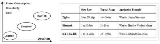 Zigbee is a low-cost, low-power wireless IoT network technology that was designed as an open worldwide standard. The IEEE 802.15.4 physical radio specification underpins the Zigbee standard, which runs in unlicensed bands such as 2.4 GHz, 900 MHz, and 868 MHz. Due to the benefits of Zigbee technology, such as low cost and low power operating modes and topologies, this short-range communication technology is best suited for a variety of applications as compared to other proprietary communications, such as Bluetooth and Wi-Fi as shown in Figure 3.