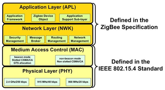 The Zigbee protocol architecture, as shown in Figure 4, is made up of a stack of levels, with physical and MAC levels defining IEEE 802.15.4 and Zigbee’s network and application levels completing the protocol.