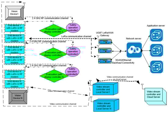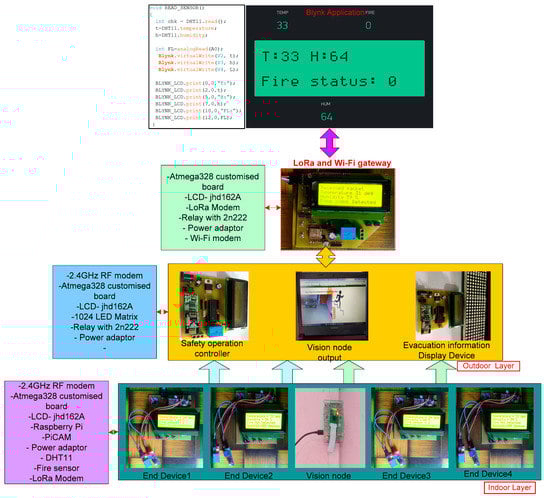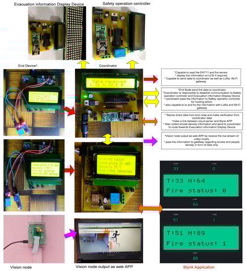 The hybrid architecture is the amalgamation of five different components namely end device, evacuation path display controller, safety operation controller, vision node, and gateway. The end device and vision node are the primary devices that are deployed in the building for sensing parameters including smoke, fire, temperature, and gas through the attached sensors and camera module. The end device is embedded with a 2.4 GHz Zigbee and LoRa RF module. The 2.4 GHz Zigbee enables “N’ number end devices to transmit the sensory data to the evacuation path display controller and safety operation controller. Here, the safety operation controller analyzes the data, and in the case of a fire, it immediately triggers the sprinkler system at the place where the fire was initiated. The evacuation path display controller also analyzes the sensory data received from the end device and provides the visualization of the safe evacuation path for the people in the building.