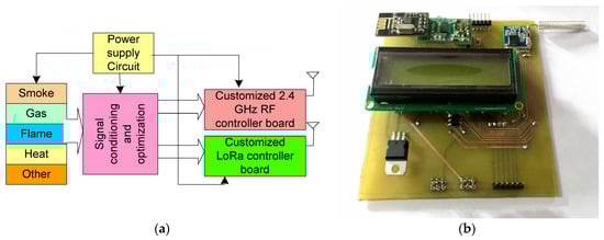 The end device senses the parameters of fire including smoke, fire, temperature, and gas and communicates to the evacuation path display controller, safety operation controller with the 2.4 GHz based Zigbee, and to the gateway via LoRa, as shown in Figure 6a. Smoke and flame sensors are employed to sense smoke and fire. A gas sensor is integrated for detecting gas leakage, which can also cause a fire explosion in the building. All these sensors are integrated into the controller board, where the signal optimization is processed. The power supply circuit supplies the external power to the components presented in the node. Figure 6b presents the final hardware prototype of the end device, which visualizes the hardware that will be positioned in the building. A liquid crystal display (LCD) is integrated on the end device hardware to display the sensor values.
