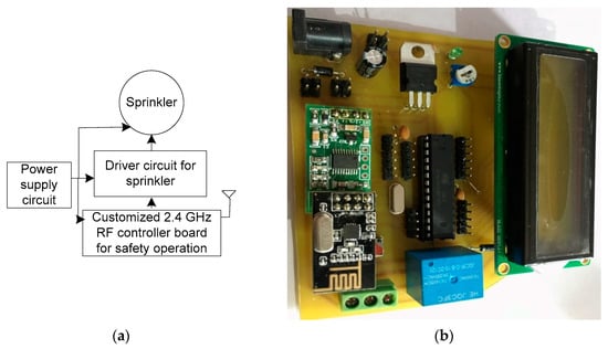 The safety operation controller acts according to the sensor data received from the end device regarding fire, smoke, and gas, and the block diagram of the safety operation controller is shown in Figure 9a. This controls the sensor value, if the received sensor value signals a fire, then the sprinkler connecting to the controller is switched on. A fire sprinkler system is an active type of fire protection system that discharges water in the event of a fire. Automatic sprinkler systems are often considered the most significant component of a building’s fire protection strategy. The hardware prototype of the safety operation controller is shown in Figure 9b, where the blue component is a driver for switching on the sprinkler.