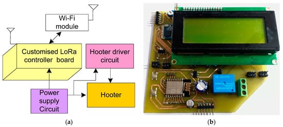 The LoRa Gateway is employed to communicate the real-time data of the end device to the cloud server. This gateway combines the LoRa and Wi-Fi module to establish the communication between the end devices and cloud server. Moreover, the gateway is integrating with an alarm to alert the fire authorities to the accident. The block diagram in Figure 10a presents the interface of the components with the control unit. As discussed earlier, the gateway is embedded with two different communication protocols, and it can be visualized in the PCB layout in the hardware prototype that is presented in Figure 10b.