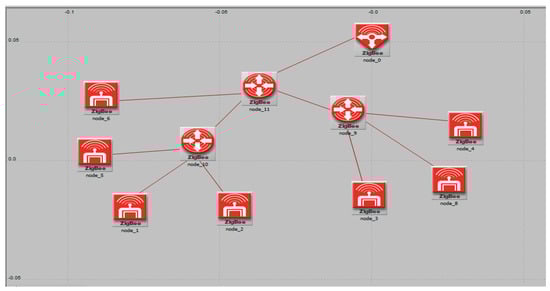 The simulation of the Zigbee network for the proposed system was carried out and performance analysis concerning various parameters was calculated. The Riverbed simulation model was used to realize the Zigbee framework, as depicted in Figure 11. It was tested based on start topology and was configured as per the parameters stated in Table 1. In this case, we used various performance indicators such as sent and received traffic statistics, the end-to-end delay between layers, the packet delivery ratio, retransmission attempts, and throughput over the channels.