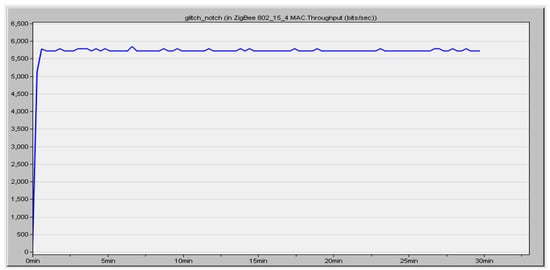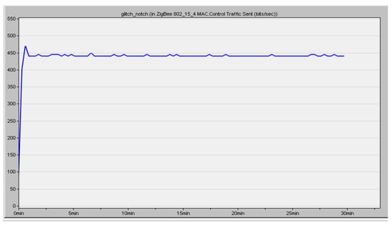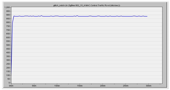 Figure 12 shows the simulation result of the packets received by the nodes in the ZigBee network. This simulation was carried out over the timeline. The packets were received at the speed of 900 bits/s throughout the timeline. Figure 13 illustrates the packet sent by the sender node to the target node over a timeline. It was configured to receive the data at a speed of 450 bit/s. Based on our analysis, we received a PDR of about 0.80. In another way, we can say that nodes established communication with 80% accuracy.