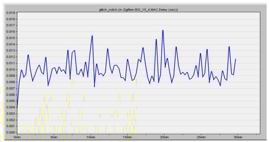 End-to-end delay refers to the overall time used by the packet generation and node transfer processes. It is made up of the total time spent on route finding, queuing, propagation, and transferring. As shown in Figure 14, end to end delay analysis was carried out over the timeline. The maximum end-to-end delay was 0.016 s found at 20 min and the minimum end-to-end delay was 0.008 s found at 11 min.