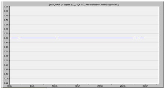 Retransmission attempts are the overall amount of retransmission tries made by all 802.15.4 MACs in the network until a packet is successfully sent or the attempt limit is reached. Figure 16 illustrates the retransmission attempts were 0.5 packets for the simulation period of 30 min.