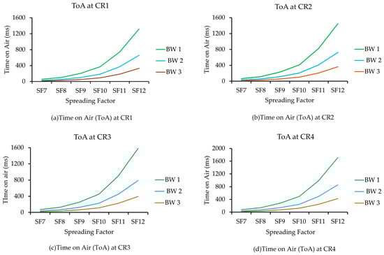Figure 17 illustrates the ToA for the payload size of 28 bytes. The ToA graph in different CR indicates that after the SF 9 the ToA began to rise. The ToA was high for the 125 kHz BW of all three BW, while the 500 kHz BW was low. CR is shown to be exactly related to the growth of the ToA, e.g., at CR 1, BW 1 ToA was 56.58 ms, and the CR 4 ToA was 78.08 ms at the same BW1.