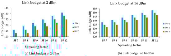 The sum of losses and benefits is the link budget or power received. For calculation of the link budget, the three BW were 125 kHz, 250 kHz, and 500 kHz, and SF 7 and SF 12. The bandwidth is shown as BW1, BW2, and BW3 (125 kHz) (500 kHz). The transmission power was 2 dBm and 14 dBm. The rise in Tx led to a rise in connection budget, as can be seen in Figure 18. Any increase in the SF increased the budget for the connection. The connecting budget reached a maximum dBm at SF 12 at 14 dBm for 125 kHz. Low dBm for 500 kHz was measured at SF7 of 2 dBm from the link budget. High Tx power and low BW power are appropriate parameters for attaining a high link budget.