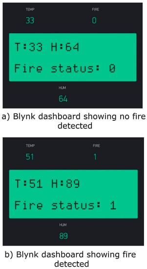 Table 4 illustrates the comparative analysis of the proposed system with previous studies implemented for building fire evacuation paths. The comparative analysis was performed based on certain parameters, namely: hardware, data collecting device, network simulation analysis, communication technology, and user interface. From the comparative analysis, it is concluded that the proposed system is superior to the previous studies in terms of implementing fire detection with customized hardware based on an Atmega 328P microcontroller, 2.4 GHz, and LoRa communication. Moreover, a hybrid architecture is proposed for establishing IoT enabled evacuation system. Network simulation of Zigbee and evaluation metrics of LoRa were performed in this study. The proposed architecture was realized with the Blynk cloud server application, where the hardware data were logged from the hardware into the cloud server. The majority of the study implemented evacuation paths on the simulation platform and limited studies have utilized hardware for executing the evacuation system. Dijkstra’s algorithm was tested and recorded on the exit display hardware to implement the evacuation path in real-time.