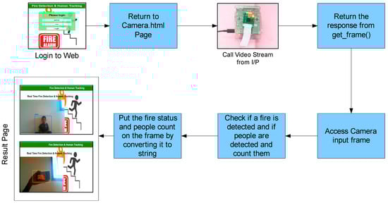 - The vision-based system with a web application also shows real-time visuals for fire status and people detection.