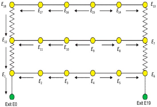 The equivalent diagram of a building is also shown in Figure 26. Here, the rooms are replaced with bubbles, the stairs are replaced with jagged lines, and the straight lines are replaced with straight lines. Each entity acts as a node called {E0, E1, …, E19}. In this case, {E0 and E19} are the target nodes, {E1, E2, …, E18} are the source nodes. Equivalent lengths of canals are not the same, due to different factors in the ease of evacuation routes under different road traffic conditions. As the equivalent distance increases, the weight of the route in the weighted graph increases.