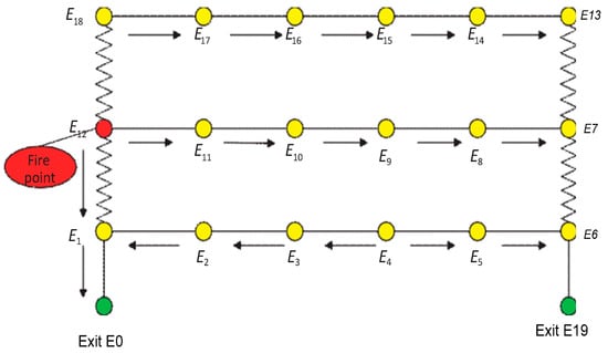 To improve overall safety and evacuation efficiency, the subsequent fire alarm should not modify the completed emergency evacuation route directions, as changes in evacuation direction generate panic. If a source node’s sensor nodes detect a fire emergency and the source node is closest to transit node E12, the source node is activated. Evacuees are unable to pick channel E18, E12 because it becomes extremely contaminated by a smoke stream in a relatively short period. Figure 27 depicts the analogous diagram of a structure with nodes during a fire emergency. Because the computed evacuation route based on the shortest distance is now inaccurate, it cannot be utilized as a guide for the safety of the evacuation plan.
