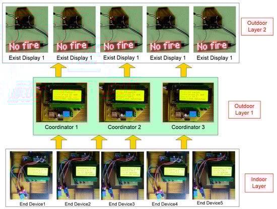 IoT is an emerging technology that enhances every area with its real-time monitoring application from any remote location. Moreover, the advanced and robust wireless communication technologies meet the requirement of IoT. In fire safety, the significance of establishing a real-time evacuation path is possible with a personal area network (LAN) and wide area network (WAN) for overcoming the network connectivity in terms of cost, energy consumption, and license band. With this advantage, in this study, a novel and hybrid IoT-enabled architecture based on 2.4 GHz Zigbee and LoRa communication protocol is created and is shown in Figure 5.