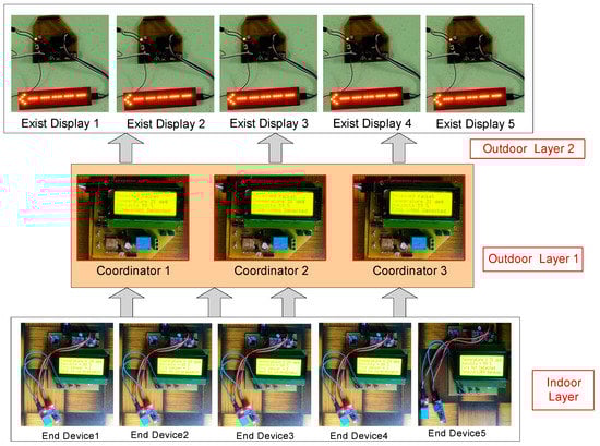 When there is no fire alarm signal from the end devices, the coordinator will send a command to the display module to display the normal direction or announce that there is no fire. The operating model of the evacuation guidance system in the absence of fire is shown in Figure 28. If there is a fire detection signal from the end devices, the coordinator sends a command to the output display module to display the direction according to the decision pattern to provide an optimal and safe exit for evacuees. The operating model of the exit guidance system is shown in Figure 29.