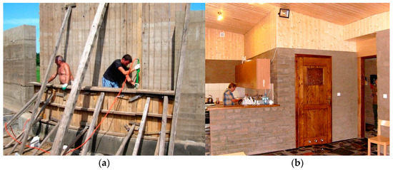 The energy-efficient construction was a leading idea. Rammed earth in the formwork was chosen for the structural and external walls. In order to reduce costs of transport the soil from excavations on the plot was used. Some of the walls have an irregular curved layout to check technological possibility and difficulties of such arrangements and also to enrich the final visual effect. To achieve necessary thermal performances, the external walls were supplemented with additional layers. Traditionally the internal layer has a structural function and thermal additions are on the external side. The external walls were designed and constructed as three-layer partitions but in an experimental way we decided to situate the load-bearing layer outside. It is in the form of rammed earth monolithic walls compacted in formwork using a pneumatic compactor and our task was to check how the exposed earth surface will behave in the severe climate of northern Poland (Figure 2a). An additional task of such an arrangement was to show the natural surface of the compacted earth wall as an illustration and presentation of an unusual technology. The internal layer of the external wall was made of clay and straw compacted mass blocks. They are finished with earth plaster to regulate the humidity of the interior and partly with a natural surface impregnated with varnish in order to stop the material from chipping (Figure 2b). The space between the structural external layer and the internal blocks is filled with thermal insulation material—here mineral wool [10].