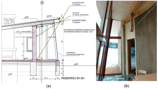 Veranda with accumulation wall: (a) Section through glazed veranda and accumulation wall. Arrows show angle of sun rays on March 21 and December 21 at 12:00 pm. (b) View of glazed veranda and accumulation wall.