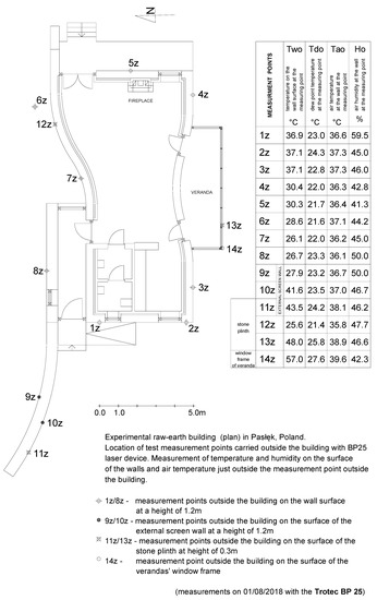 Measurements of temperature and humidity on the surface of the walls and air temperature were taken for specified points on the figure below (Figure 10).