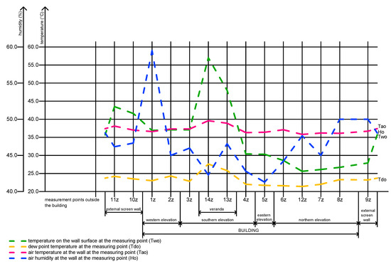 The following diagrams and charts show the results of the measurement data collected on the day of the survey. Each of the diagrams and charts relates to data collected at individual measurement points by the selected measuring devices. The results of measurements with the Trotec BP 25 of exterior of the building are shown below (Figure 5).
