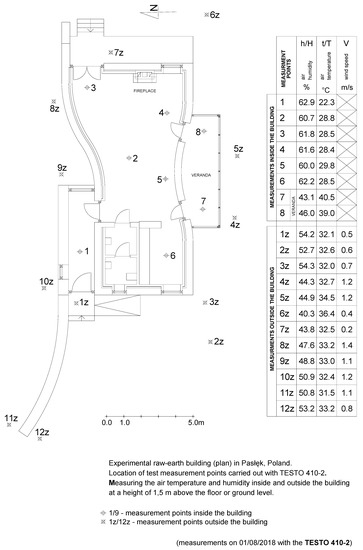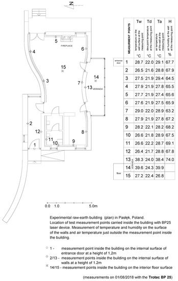 Plan of the experimental raw-earth building in Pasłęk with the placement of measurement points carried inside and outside the building with TESTO 410-2.