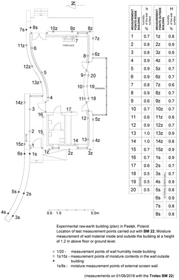 Plan of the experimental raw-earth building in Pasłęk with the placement of measurement points carried outside the building with BP 25 laser device.