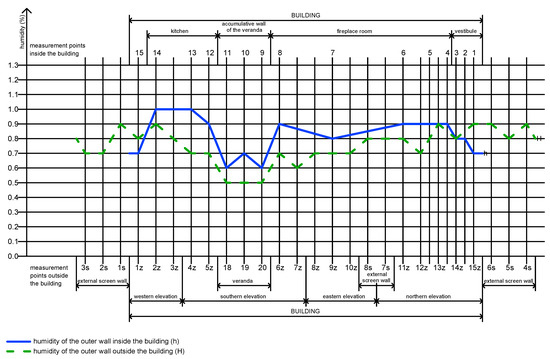 Measurements of the humidity of the material of the wall were taken for specified points on the figure below (Figure 8).